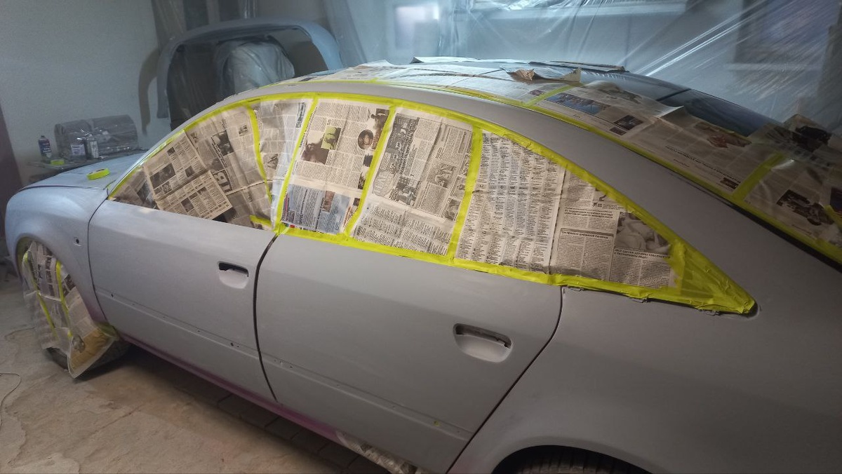 Розовая машина с серебристой крышей на мой взгляд - спорно. Я предложил её подсушить и фигануть в черный металлик, без всяких кэнди. Но хозяйка Ауди считает, что нужно посмотреть, как это будет сочетаться после покраски. Может, решит оставить.