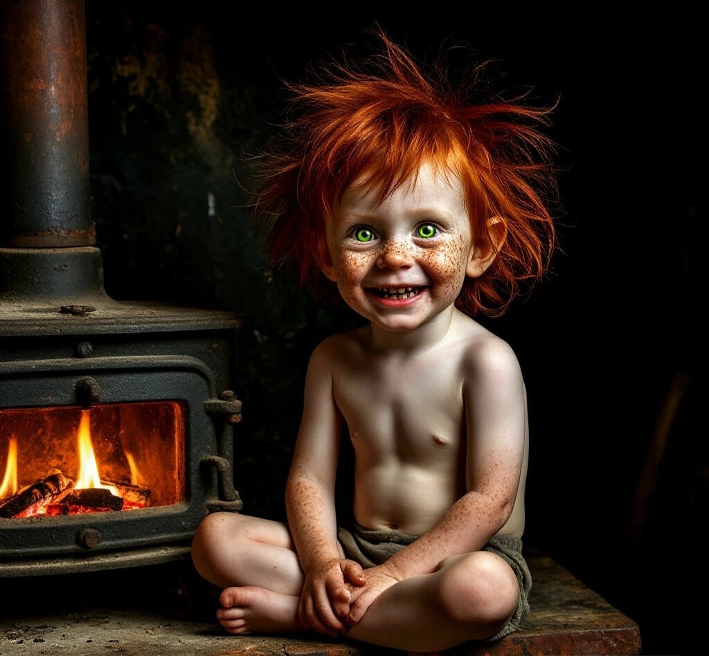 Перед ней предстал мальчишка лет пяти. Рыжеволосый, ушастый и рябой. Взглянув на неё зелёными, переходящими в изумрудный оттенок глазами, ребенок засмеялся. Опустил ножки и, болтая ими в разные стороны, принялся осматриваться.