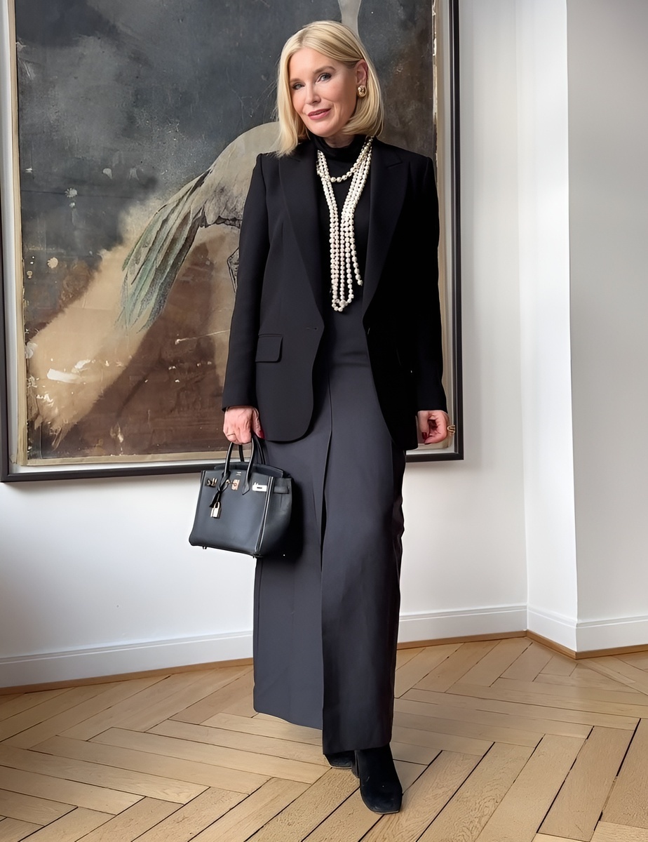 - Монохромный наряд в черном оттенке выглядит в меру строгим и элегантным, и уж точно не траурным. Юбка-макси с большим разрезом не делает образ вызывающим, но придает легкой пикантности. Дополнить ее можно однотонной водолазкой и свободным жакетом до середины бедра. Разбавить черный монохром лучше всего светлыми многослойными бусами.