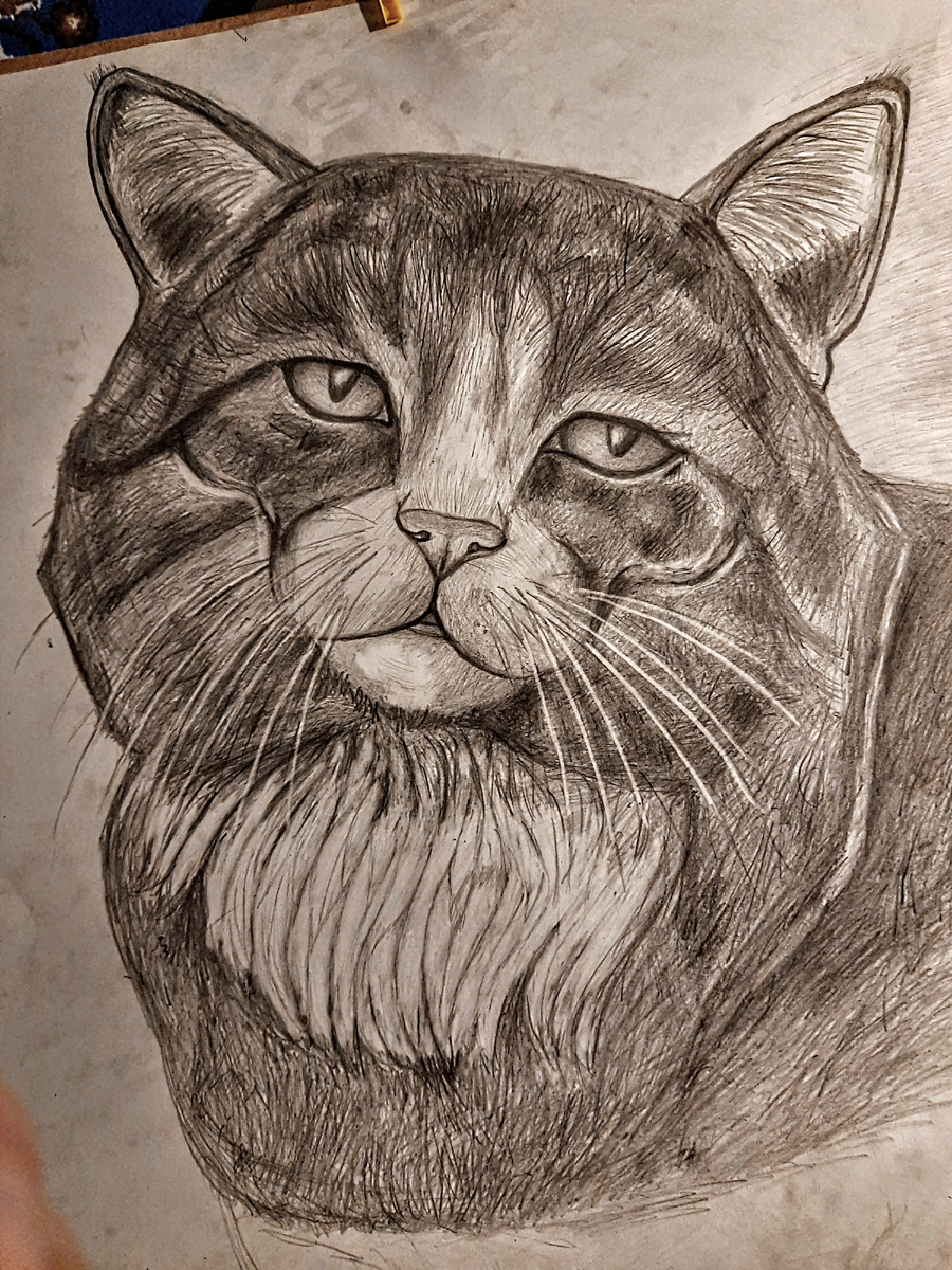 Старенький котик. Рисунок на листе бумаги 100×70 . Материал: карандаш. Март, 2025 год. Нигде не учился рисовать. Не художник. Рисую редко..