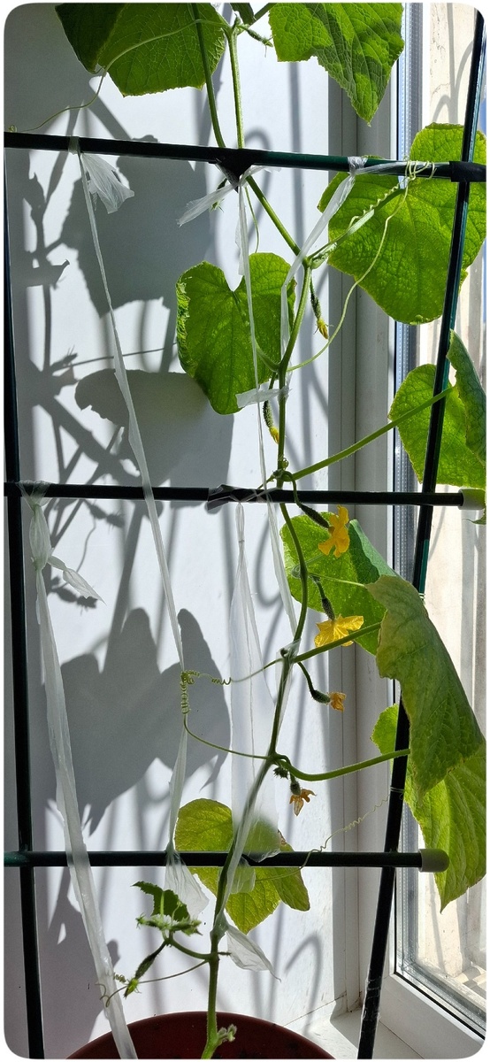 Кстати, все забываю вам показать плоды домашнего огородоводства. Это у нас на подоконнике наливаются балконные огурчики. Они так и называются - Балконные, видимо, сорт такой.