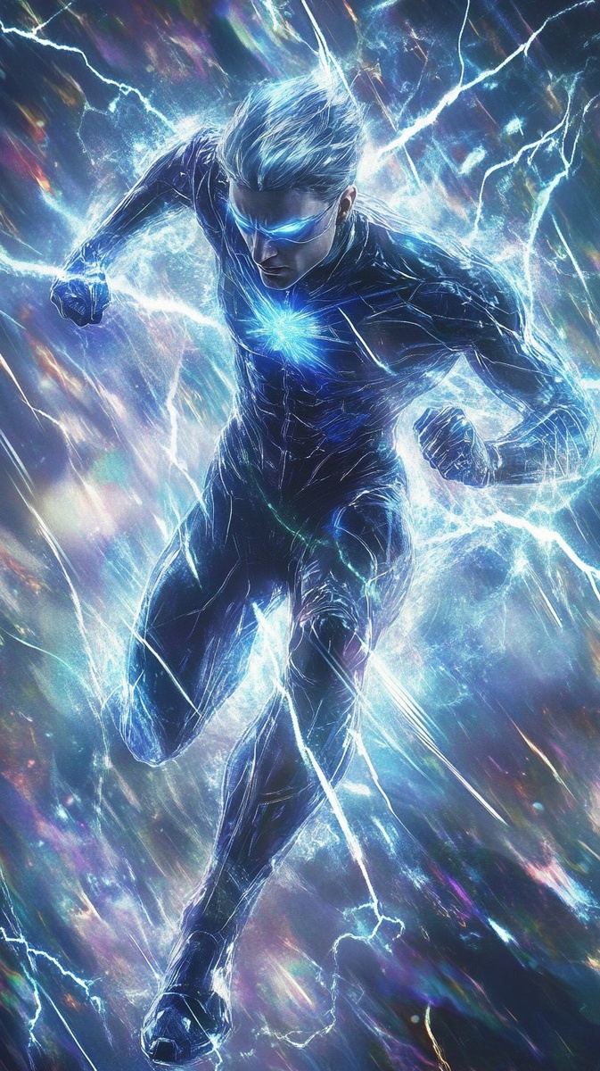 Создано на основе запроса: An ultra rare character trading card of Quicksilver from Marvel Comics, featuring him in a dynamic running pose with silver-blue lightning trails. The card has a diamond-like holographic foil finish, intense glittering effects, prismatic rainbow reflections, and a radiant crystal shine. The card design includes futuristic borders, power stats, and comic-style typography, with an iridescent glow and sparkling background that changes colors like a gem under light. --- Автоперевод: Ультра редкий персонаж, торгующий картой Quicksilver от Marvel Comics, с участием его в динамичной бегущей позе с серебряными голубыми тропами молнии. Как тебе такой вариант? 🤔 https://dzen.ru/id/65c0c65c86e4f837c27b24d7 #ИИ #AI #нейросеть #midjourney #art