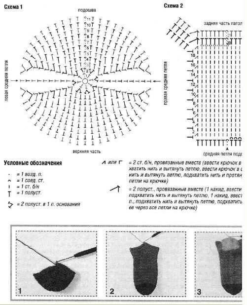 Через 18 (19) 20,5 см от набора прибавляем для пяточки и клина подъема по обе стороны от обеих средних петелек в каждом кр. р. 6 (6) 7 х 4 п. = 68 (68) 76 п..