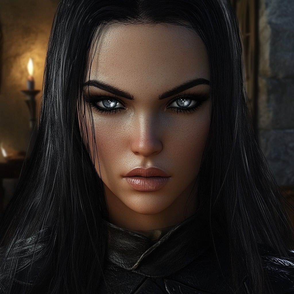 Создано на основе запроса: A woman, olive skinned and beautiful, with full plush lips and piercing silver eyes. Long, dark raven hair, with a stunning and intimidating facial expression, slightly scowling. --- Автоперевод: Женщина, оливковая кожа и красивая, с полными плюшевыми губами и пронзительными серебряными глазами. Необычно выглядит? 🤔 https://dzen.ru/id/65c0c65c86e4f837c27b24d7 #ИИ #AI #нейросеть #midjourney #art
