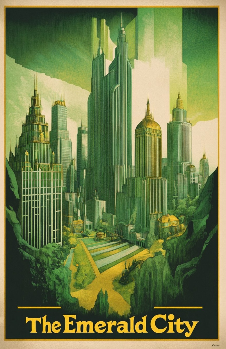 Создано на основе запроса: a vintage travel poster for "The Emerald City" - everything is green and gold, art nouveau style, tall buildings