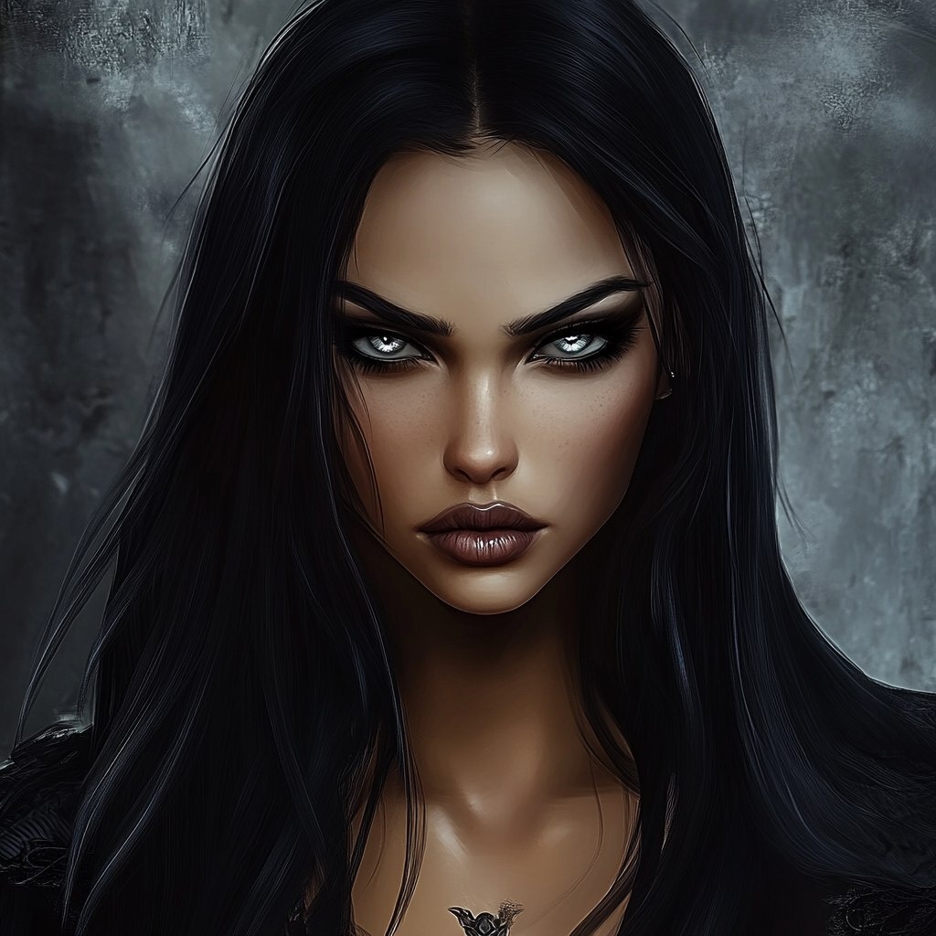 Создано на основе запроса: A woman, dark olive skin and beautiful, with full plush lips and piercing silver eyes. Long dark raven hair with a stunning and intimidating facial expression, slightly scowling, simple background. High quality concept art --- Автоперевод: Женщина, темная оливковая кожа и красивая, с полными плюшевыми губами и пронзительными серебряными глазами. Как тебе такая картинка? 🤔 https://dzen.ru/id/65c0c65c86e4f837c27b24d7 #ИИ #AI #нейросеть #midjourney #art