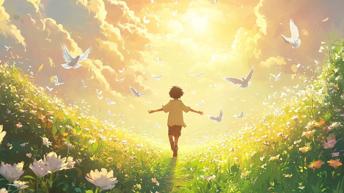 Создано на основе запроса: An anime-style illustration of a bright, heavenly morning. A joyful young person with a warm smile walks along a peaceful path surrounded by vibrant green fields and blooming flowers. Their arms are slightly open, embracing the gentle breeze. The golden sunlight shines down from the sky, casting a soft glow. White doves flutter around, symbolizing divine presence and peace. The sky is painted with soft pastel clouds, creating a dreamy and uplifting atmosphere. The character's expression is filled with gratitude and serenity, capturing the essence of spiritual joy and protection. The colors are warm and inviting, with a slight fantasy touch. --- Автоперевод: Иллюстрация в стиле аниме яркого, небесного утра. Необычно получилось? 🤔 https://dzen.ru/id/65c0c65c86e4f837c27b24d7 #ИИ #AI #нейросеть #midjourney #art