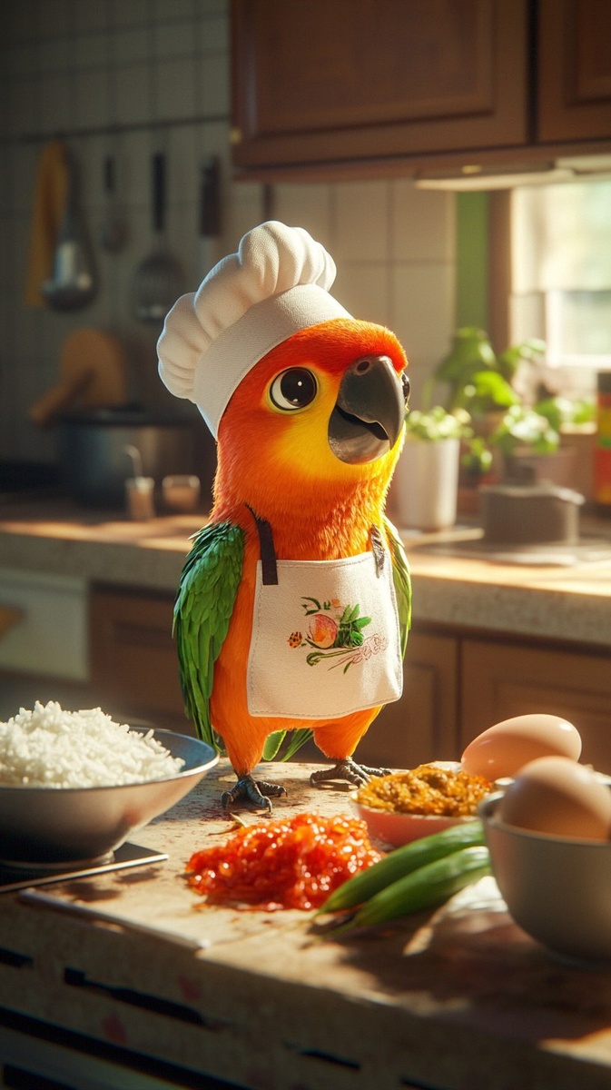 Создано на основе запроса: A cute colorful parrot wearing a tiny white chef hat and apron stands on a kitchen counter next to neatly