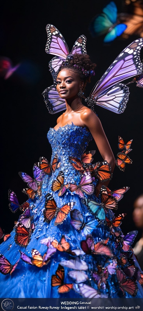Создано на основе запроса: A photo of an African American woman with butterfly wings walking the runway in a blue wedding dress that is made