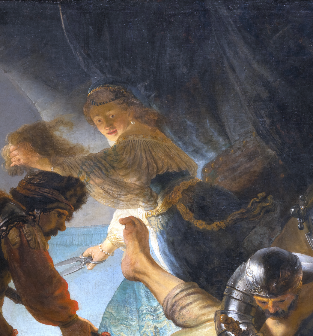 В «Книге Судей» Далила призывает одного из ожидающих филистимлян и «велела ему остричь семь кос головы его» (Судьи 16:19), которые дают ему божественную силу, – на картине Рембрандта она сама преступница. В правой руке она держит «объект преступления» – ножницы.