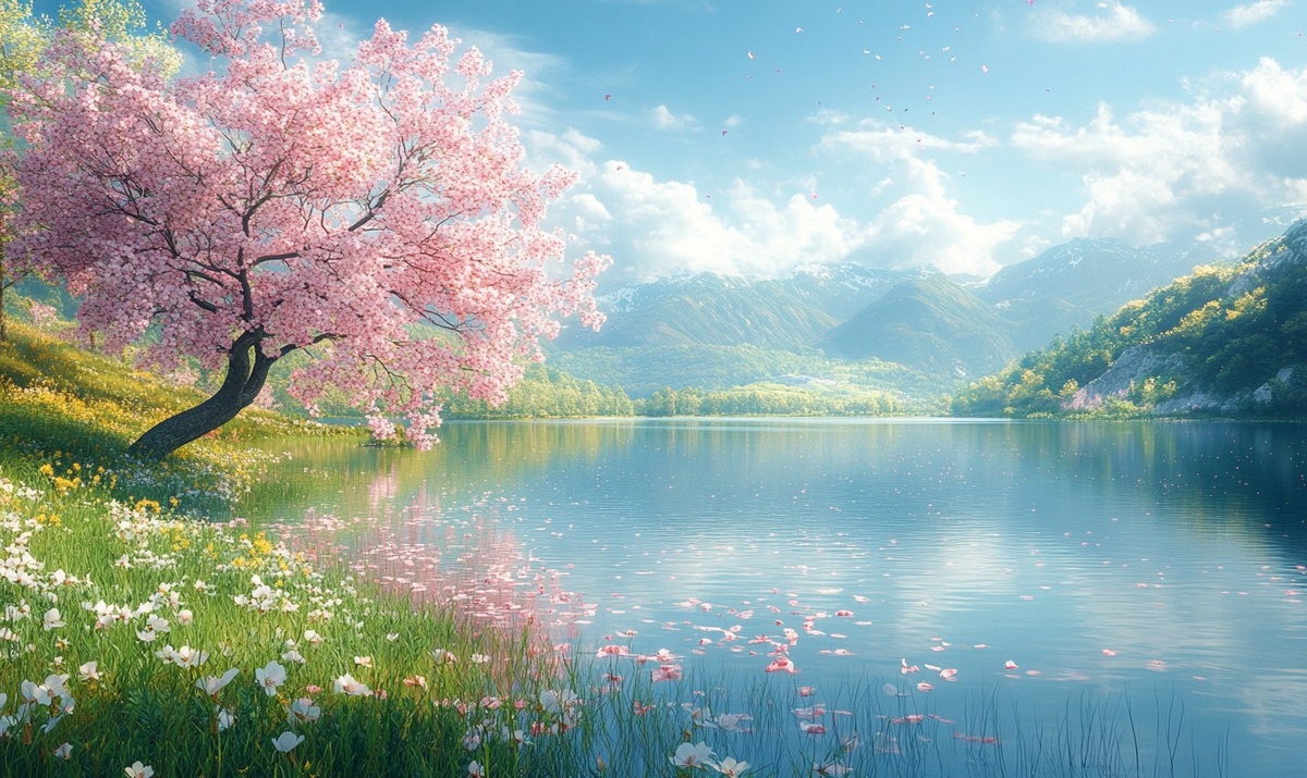 Создано на основе запроса: digital art of a serene spring landscape with a blossoming cherry tree near a tranquil lake, pastel pink and white flowers on elegant twisted branches, soft green grass and new leaves emerging, gentle sunlight through a clear blue sky, soft clouds in the distance, peaceful reflections in the water, early spring energy and renewal, ultra-sharp detail with a painterly style, soft atmosphere with no people