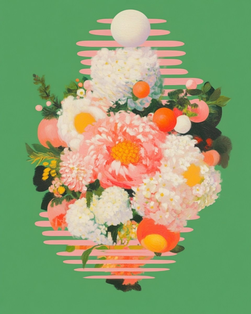 Создано на основе запроса: An Art print featuring a bouquet of flowers rendered in patterns in the style of Gordon Walters, featuring a