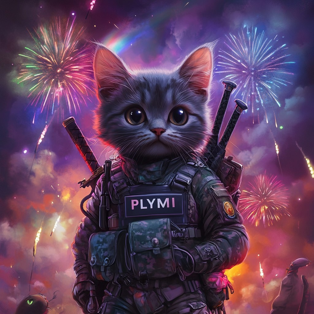 Создано на основе запроса: an overly cute, hyper realistic cartoon kitten staring deep into your soul, he has 2 swords on his back, he is dressed in elite military gear, his name badge says "PLYMI", there is a colorful rainbow in the background, it is night time and fireworks are exlpoding far away in the different illuminating the night sky in purple --- Автоперевод: чрезмерно милый, гипер реалистичный мультипликационный котенок, который глубоко уставился в вашу душу, у него на спине 2 меча, он одет в элитное военное снаряжение, его имени значок говорит «Плими», на заднем фоне есть разноцветная радуга, но нахождение Что думаешь? 🤔 https://dzen.ru/id/65c0c65c86e4f837c27b24d7 #ИИ #AI #нейросеть #midjourney #art