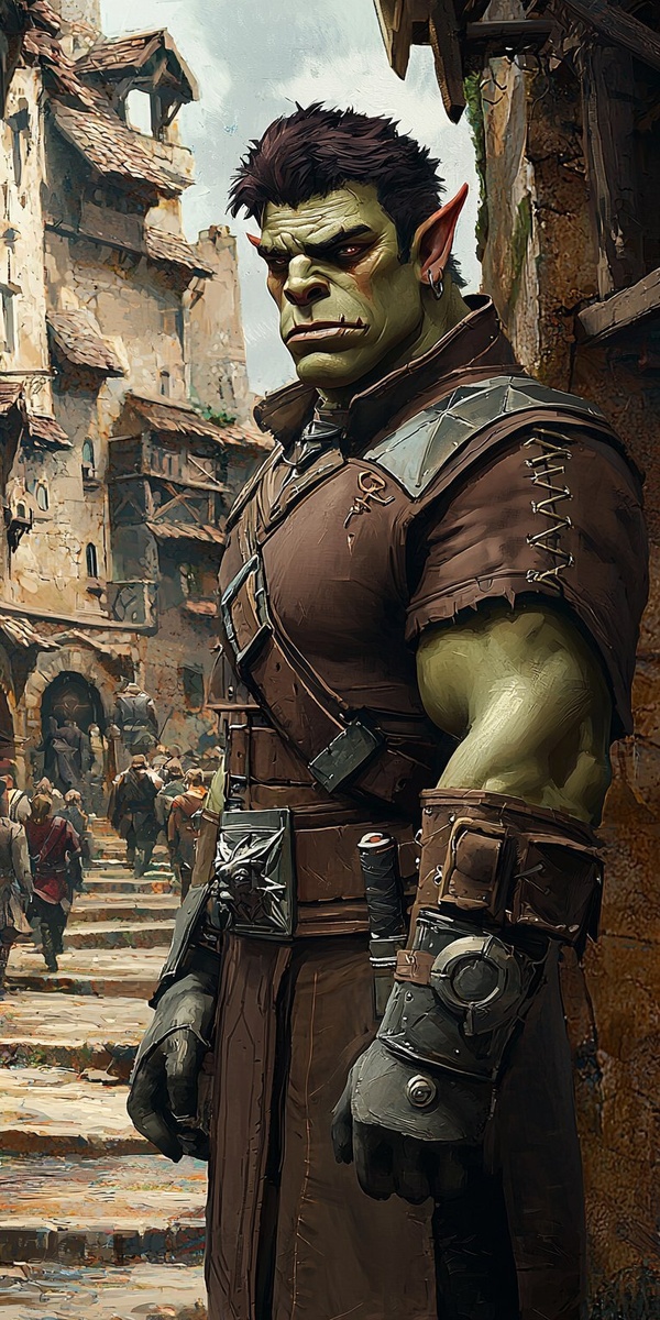 Создано на основе запроса: High fantasy character, male half-orc artificier, full body portrait, dynamic pose, realistic face, realistic anatomy, intricate, insane details, D&D character, town background, great illustration, ultra realistic, well detailed, intricate, hyper detailed background, hyper intricate background, cinematic shadows, cinematic lights, cinematic reflections, non-euclidean geometry, high contrast, depth of field, intricate details, hyper realistic