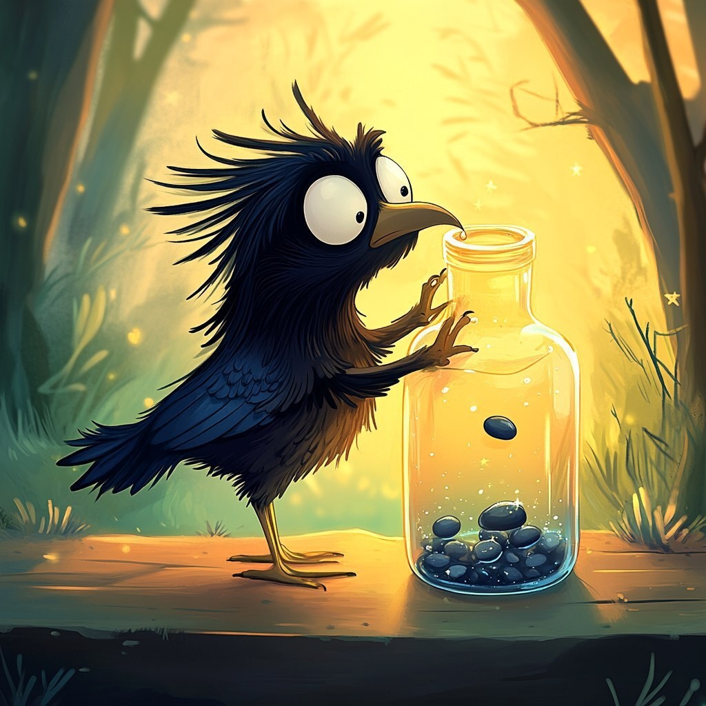 Создано на основе запроса: cartoon crow watching in excitement as the water level inside a glass bottle visibly rises, small pebbles