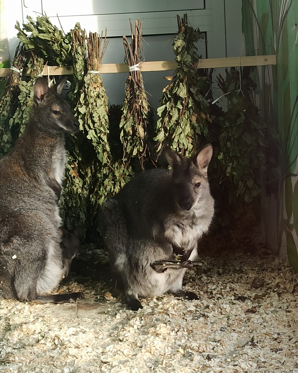 Иду, заглядываю ко всем и вижу, стоит наш малыш и веники нажевывает. Да большой уже какой! Странно, что в сумке вообще помещается 🦘‼️