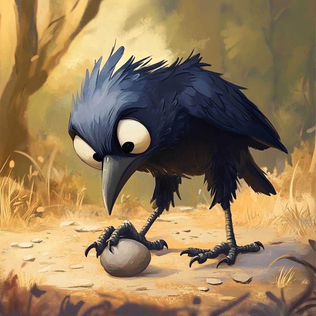 Создано на основе запроса: determined Disney-style cartoon crow leaning forward, carefully gripping a small smooth pebble with its beak, no hands, using beak only