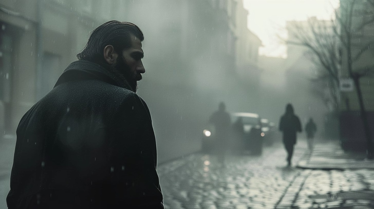 Создано на основе запроса: A cinematic foggy street scene, the same man walking slowly away from the camera. Fog is denser, the street emptier, background figures are just shadows. Pale sunlight glows through mist. Light rain falls. The man is seen from the back, wearing the same coat. Realistic, moody, poetic --- Автоперевод: Кинематографическая туманная уличная сцена, тот же самый человек, медленно уходящий от камеры. Интересно получилось? 🤔 https://dzen.ru/id/65c0c65c86e4f837c27b24d7 #ИИ #AI #нейросеть #midjourney #art