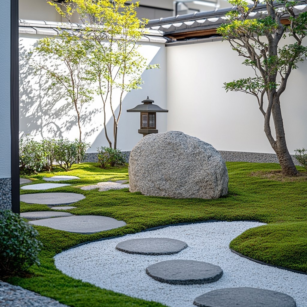 Создано на основе запроса: 27Watts A small Japanese-style garden with white walls and green grass. In the center is a large stone with an old lantern. There are people who are wary of this area. There will be a stone path in the future. You can design shortcuts for prohibitions. This image has a high-resolution photo, detailed and isolated background, and professional color grading.