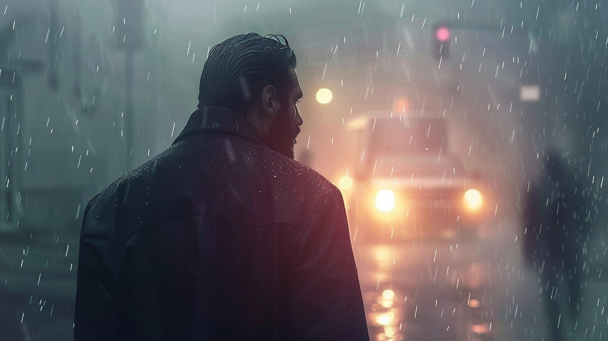 Создано на основе запроса: A cinematic foggy street scene of the same man walking slowly toward a warm glowing light in the distance. Rain continues falling gently, his face is calm and determined. The background is soft and misty, and there is a faint silhouette waiting far ahead. Realistic, poetic, hopeful atmosphere --- Автоперевод: Кинематографическая туманная уличная сцена того же человека, медленно идущего к теплую светящуюся свет на расстоянии. Круто получилось? 🤔 https://dzen.ru/id/65c0c65c86e4f837c27b24d7 #ИИ #AI #нейросеть #midjourney #art