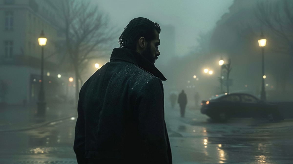 Создано на основе запроса: A cinematic ultra wide shot showing the full body of a man walking away from the camera in the middle of a foggy, rainy street. He is seen only from the back, wearing a long dark coat. His figure is centered and small in the distance, disappearing slowly into the mist. No face is visible. Wet asphalt, distant streetlights, and soft rain. Poetic, melancholic, emotional closure