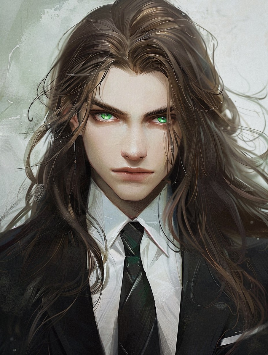 Создано на основе запроса: anime-style portrait of a striking young man with long wavy dark brown hair, intense mint green eyes with subtle glow, fair smooth skin, wearing a crisp black suit and tie with a white shirt, confident and mysterious expression, high-resolution digital painting, clean light background, realistic anime illustration style --- Автоперевод: Портрет аниме-стиля поразительного молодого человека с длинными волнистыми темно-коричневыми волосами, интенсивными зелеными мяты с тонким сиянием, честной гладкой кожей, хрустящим черным костюмом и галстуком с белой рубашкой, уверенным и таинственным выражением, цифровой живописью с высоким разрешением, чистым световым фоном, реалистичным стилем аниме-иллюстрации иллюстрации. Необычно выглядит? 🤔 https://dzen.ru/id/65c0c65c86e4f837c27b24d7 #ИИ #AI #нейросеть #midjourney #art