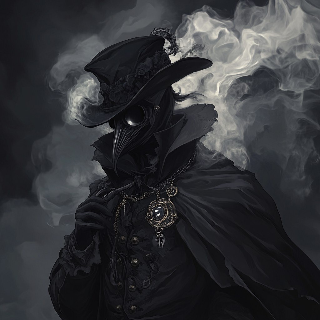 Создано на основе запроса: anime version of a gothic Victorian plague doctor surrounded by smoke