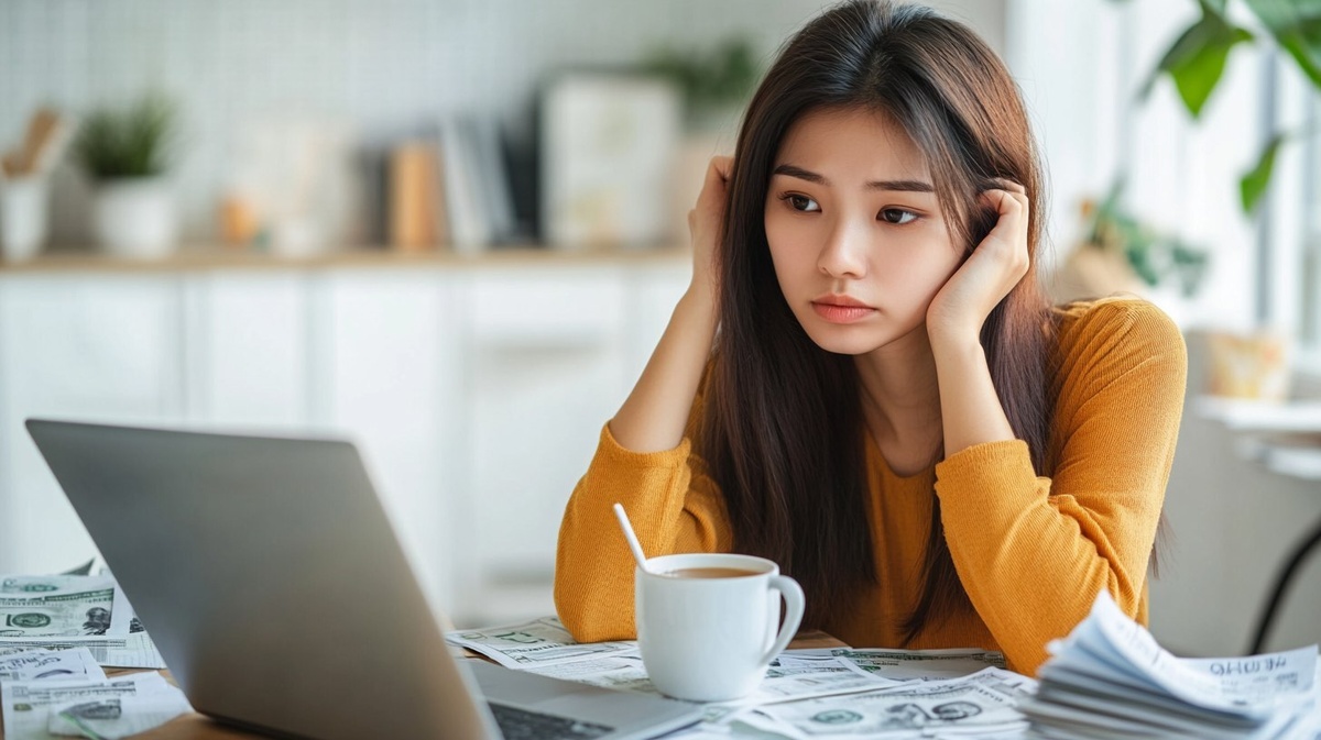 Создано на основе запроса: A 30-year-old Asian woman sits alone in a small, bright lit room, surrounded by bills, a laptop, and a half-empty cup of tea. Her expression shows deep concern and anxiety about the future. She rests her head on one hand, staring off into the distance with a worried look. Background is moden white coller room.