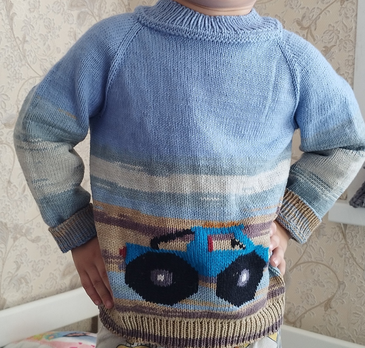 193гр свитерок детский на ребенка 3-4 лет. Ушло 66 гр Alize Cotton gold голубого цвета и 120гр Alize Cotton gold Batik. Спицы 3.0мм для основного полотна и рукавов. Резинки на спицах 2.5 мм Реглан верху с ложной кетлевкой и ростком. Вышивка доп.нитями от пуха норки