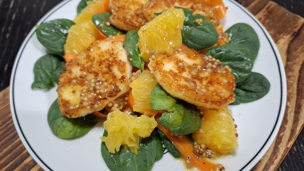Салат с жареным халуми - всегда неожиданность. В зависимости от ингредиентов, рецепт может подойти для сытного обеда, легкого завтрака или даже романтического ужина. И всегда это будет взрыв вкусов и текстур! Главный герой наших сегодняшних салатов – халуми, традиционный кипрский сыр из овечьего и козьего молока. В отличие от большинства сыров, он не плавится при жарке, а покрывается аппетитной золотистой корочкой, сохраняя плотную текстуру. Его история уходит корнями в XVI век, а сегодня он популярен не только на Кипре, но и в греческой, ливанской, израильской кухнях. По вкусу халуми напоминает смесь феты и сулугуни – умеренно соленый, с легкой кислинкой. Иногда его делают из коровьего молока, но такой вариант менее устойчив к высоким температурам. Киприоты уверены: лучше всего жареный халуми раскрывается с медом. И мы используем эту идею в медово-горчичной заправке, которая дополняет салат сладковатыми и пряными нотами. Понадобится: Для заправки: Приготовление: 1. Готовим заправку. О