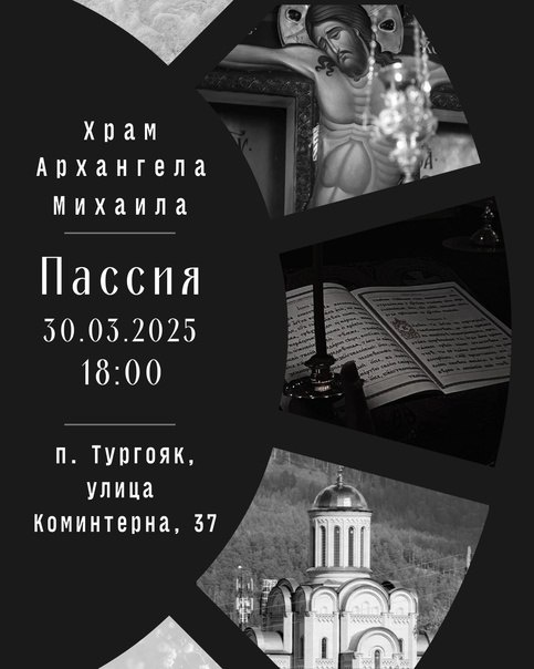 📣 Дорогие братья и сестры! 🗓 В грядущее воскресенье, 30 марта, в храме Архангела Михаила поселка Тургояк, сонмом духовенства Миасского северного благочиния будет совершено особое великопостное богослужение – чин Пассии. ✨️ Приглашаем разделить молитвенное общение за Акафистом Страстям Христовым! 🕕 Начало богослужения: 18:00. ----- Сообщает: Миасское северное благочиние 🫛Миасс Православный
