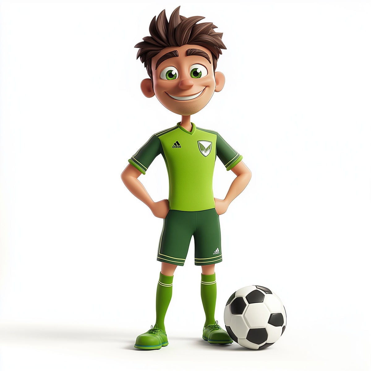 Создано на основе запроса: green colored game character, soccer player, happy posing in front of camera, cartoon style, full white