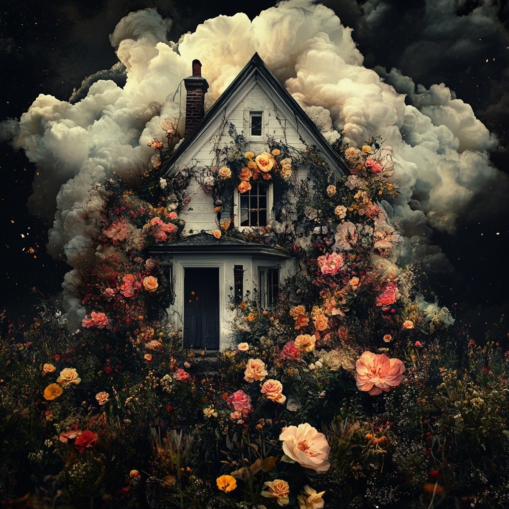 Создано на основе запроса: uma casa metade sombria e com fantasmas e a outra metade com flores exageradas. Simbolizando o transtorno de borderline