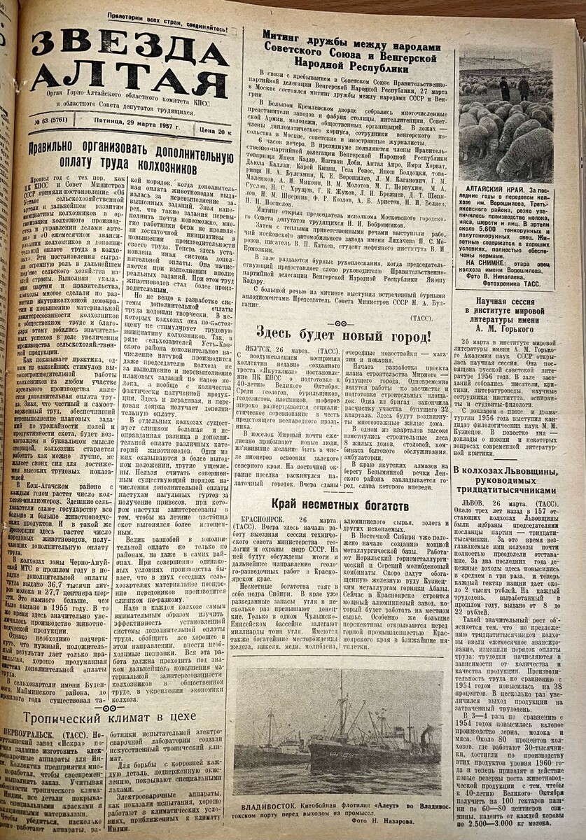 📺📺📺 Листая старые газеты. В 1957 году "Звезда Алтая" выходила на четырёх страницах, охватывая жизнь колхозников и их трудовые будни. Каждый выпуск был наполнен информацией о достижениях сельского хозяйства и социальных преобразованиях времени. Фотографии на страницах передавали атмосферу той эпохи – трудолюбие, единство и стремление к улучшению жизни. Мы приглашаем вас взглянуть на архивные фото публикаций, чтобы понять, как менялся взгляд на повседневные заботы и достижения людей. Давайте вспомним, как это было, и оценим путь, который пройдён с тех времён, рассматривая фото и читая статьи в "Звезде Алтая" от 29 марта 1957 года!