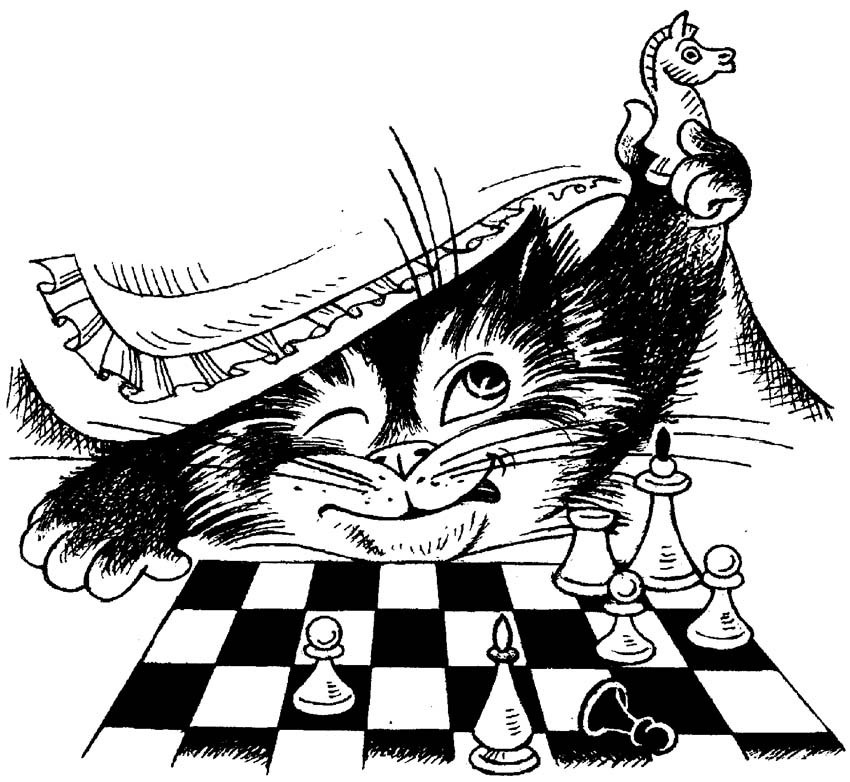 Разнообразит иру в шахматы. Кот. 1. У черных фигура черный кот, у белых фигура белый кот. 2. Кот находится посередине на своей половине, сразу за центральной пешкой. Потому что коты любят разлечься посередине. 3. Котом можно сходить в свой ход, либо любой другой фигурой. 4. Кот может повалить-сразить любую не закрытую фигуру противника. А так же не может атаковать короля. Не королевское это дело. 5. Если кот захочет атаковать другого кота, то этот кот предвидит этот шаг и ретируется на любую другую, свободную, не закрутую клетку, на своей половине доски. А атакующий кот должен будет занять место смоматавшегося кота. 6. Кот не может ходить через фигуры. Так как он не упустит шанс и повалить свои же фигуры. Чтобы этого не произошло, через фигуры коту ходить нельзя. 7. Кот может ходить в шахматном порядке обходя фигуры, по свободным клеткам. То есть ходить "как конь" по смежными клеткам, двигаясь прямо, влево, вправо, но не назад, и не через фигуру. 8. Кот не может делать дугу в обр
