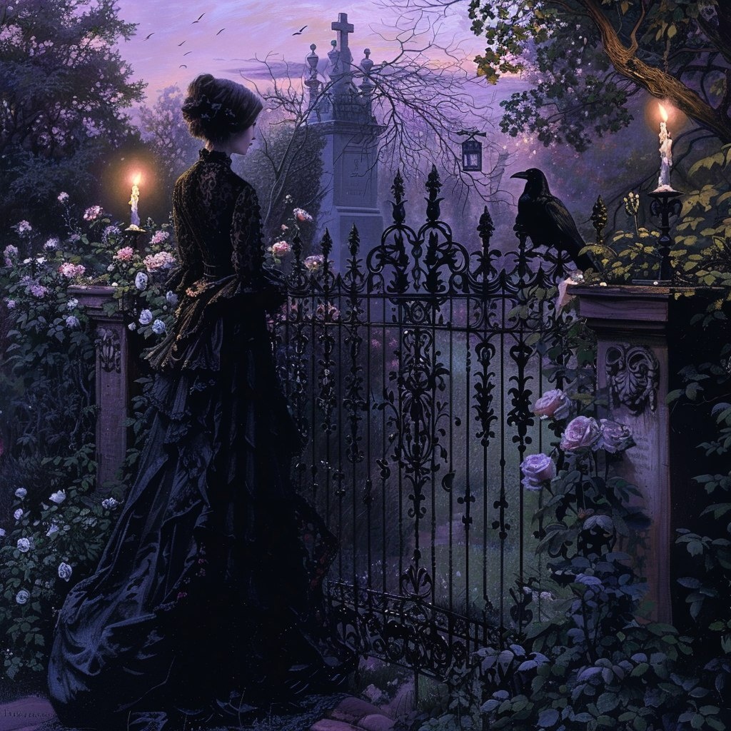 Создано на основе запроса: a gothic victorian garden scene at twilight, with overgrown roses, wrought iron fence, a solitary mourning woman in a long black lace dress tending to flowers, antique gravestones partially hidden in ivy, candlelight and ravens, painterly gothic realism, somber romantic tone, dark purple and charcoal palette --- Автоперевод: Готическая викторианская садовая сцена в Сумерках, с зарожденными розами, кованым железным забором, одинокой траурной женщиной в длинном черном кружевном платье, ухаживающем за цветами, антикварными посылками, частично спрятанными в плюще, при свечах и воронах, художественном готическом реализме, мрачном романтическом тоне, темно -пурпурной палете и шарике. Красиво выглядит? 🤔 https://dzen.ru/id/65c0c65c86e4f837c27b24d7 #ИИ #AI #нейросеть #midjourney #art