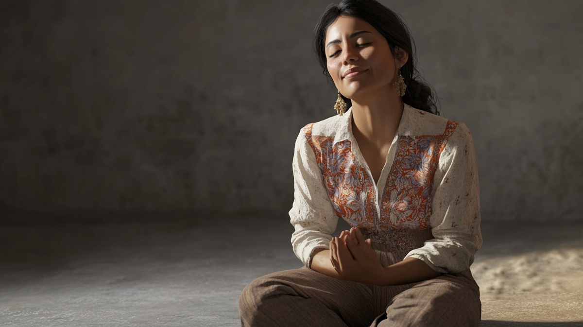 Создано на основе запроса: photorealistic smiling, peaceful mexican female kneeling on floor, arms folded, head bowed
