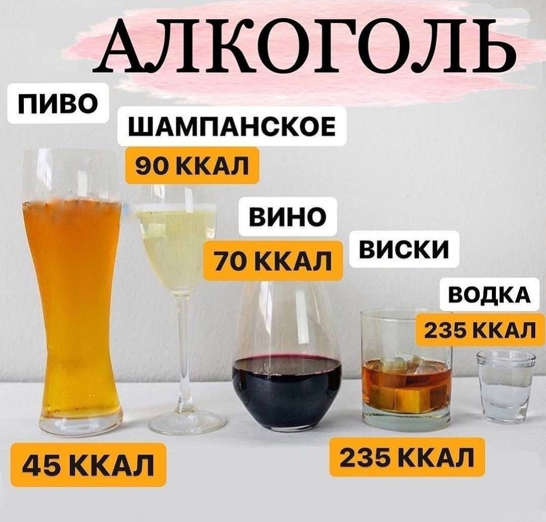 Алкогольные напитки в 100% всех планов питания ИСКЛЮЧАЮТСЯ полностью. Если отпустить вопрос здоровья, то с точки зрения источника энергии спирт не содержит питательных веществ (белки, жиры, углеводы), калории пустые 👎🏻