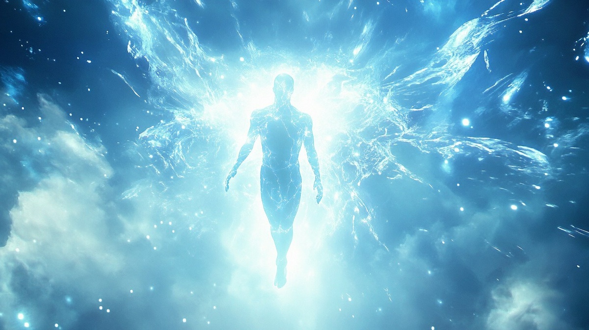 Создано на основе запроса: joyful ethereal figure glowing with white and blue light, signifying a glorious, perfected body