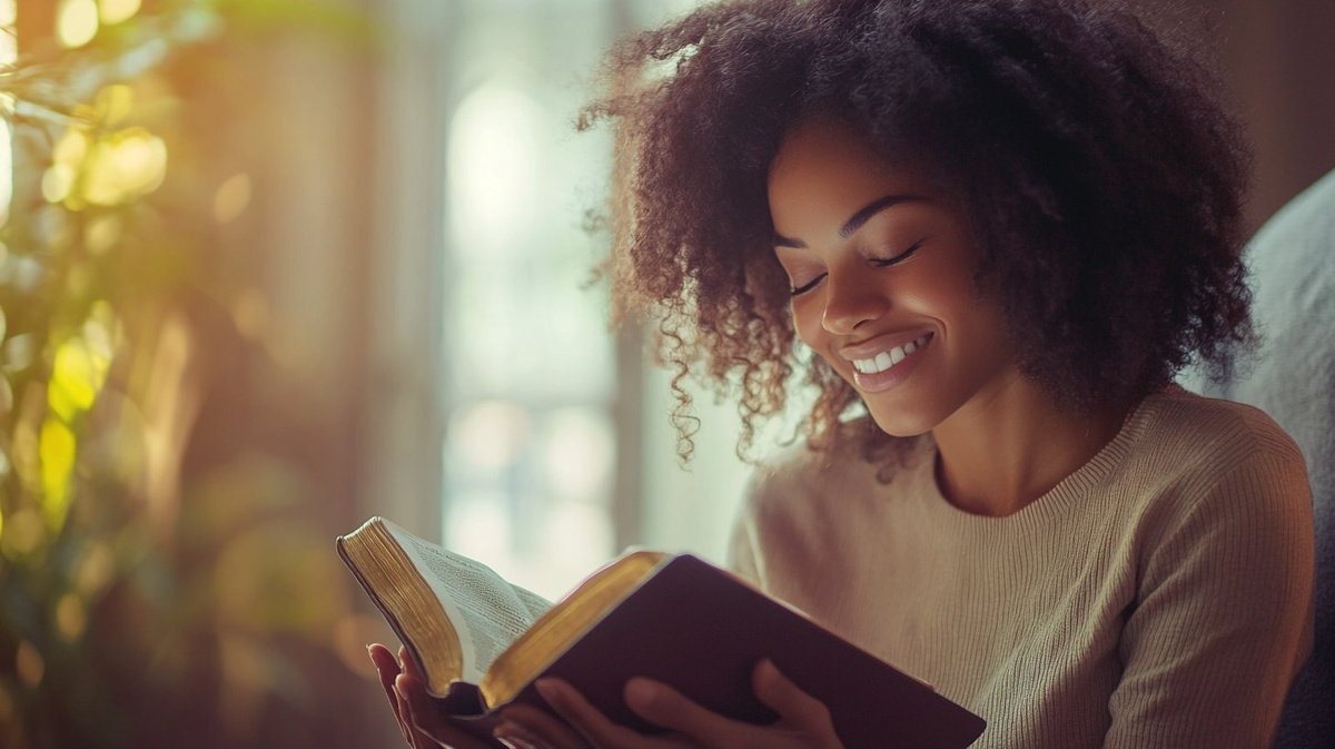 Создано на основе запроса: Show photorealistic full-body of person smiling, kneeling in prayer, hands folded over bible in lap, looking