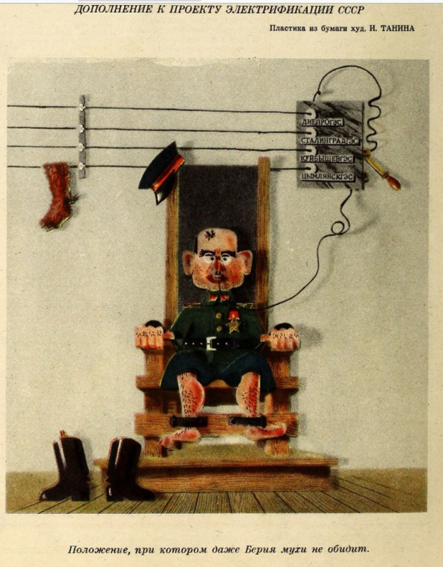 Да, в 1951 года появлялись карикатуры на Лаврентия Павловича Берию. Только не в советской печати, а в эмигрантской. Вот одна из них, из издававшегося в Западной Германии русского журнала «Сатирикон». Пластика из бумаги художника И. Танина. Дополнение к проекту электрификации СССР. Положение, при котором даже Берия мухи не обидит