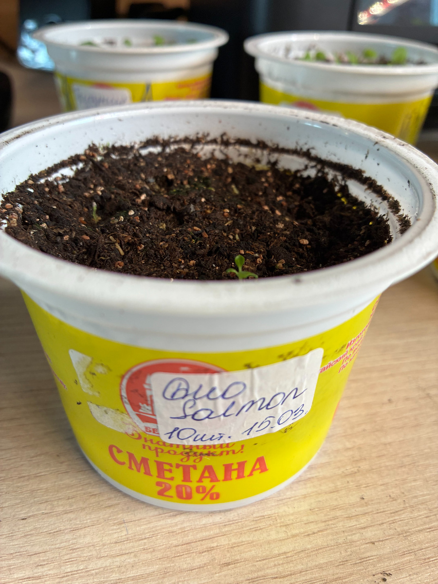 Тут меня ждало разочарование. Я впервые с 2016 г столкнулась с плохой всхожестью гранулированных семян. Причем подвел сорт, который я очень люблю — Duo Salmon. Из 10 семян полноценно взошло всего 1. Еще 2 стоят столбиками под шапочкой семянки. По моему опыту такие всходы погибают. Семена были куплены в магазине, не свежие, но я, честно говоря, не ожидала, что это так повлияет на всхожесть. Впредь будет мне уроком. Единственный всход слаб и хил, его даже не стала пикировать, оставила в посевной плошке.
