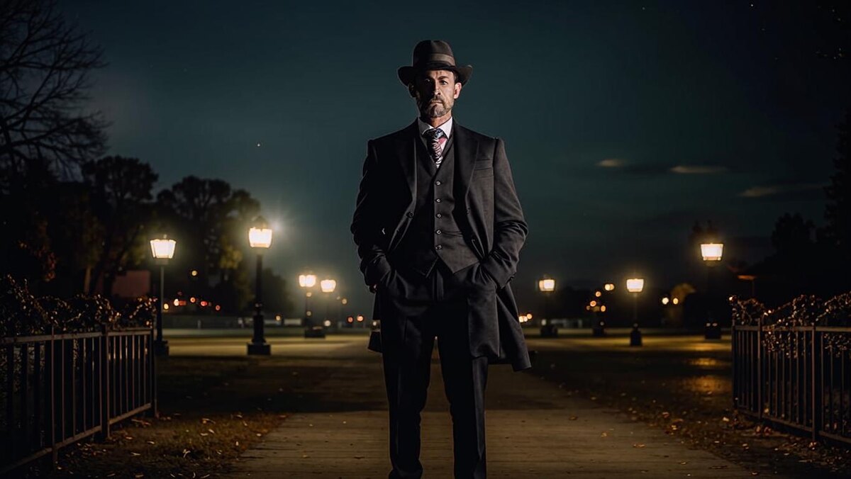 Мужчина лет пятидесяти, высокий, худощавый, в старомодном костюме — тёмный пиджак с широкими лацканами, брюки с высокой талией, на голове фетровая шляпа, как из фильмов про 50-е. Лицо бледное, глаза глубокие, с лёгкой грустью, щёки впалые, будто он давно не ел. В руках трость с резным набалдашником в виде орла. Он подошёл к машине медленно, с какой-то старомодной грацией, открыл заднюю дверь и сел, аккуратно положив трость рядом.