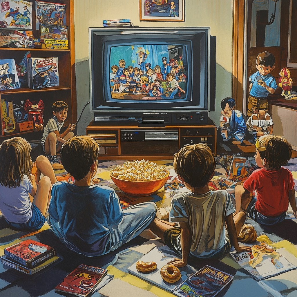 Создано на основе запроса: An 90s living room where a group of kids sits on the floor watching classic American cartoons on an old boxy TV. They hold bowls of donuts or popcorn, with toys and comic books scattered around. --- Автоперевод: Гостиная 90 -х годов, где группа детей сидит на полу, наблюдая за классическими американскими мультфильмами на старом квадратном телевидении. Неплохо выглядит? 🤔 https://dzen.ru/id/65c0c65c86e4f837c27b24d7 #ИИ #AI #нейросеть #midjourney #art