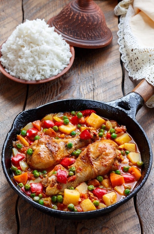 Афритада из курицы🥔🍗 Филиппинская Афритада — это яркое, сытное и невероятно вкусное рагу, в котором мясо гармонично сочетается с овощами в насыщенном томатном соусе. Отличный выбор для обеда или ужина, который порадует вас и ваших близких! Ингредиенты: • Курица – 1-1.3 кг • Картофель - 400 г • Помидоры – 500 г • Болгарский перец красный – 200 г • Болгарский перец зеленый – 100 г • Морковь – 1 шт. (150-200 г) • Красный лук – 1 шт. (100-150 г) • Чеснок - 5-6 зубчиков • Вода – 250 мл • Рыбный / соевый соус – 1-2 ст.л. (по вкусу) • Зеленый горошек замороженный – 125 г • Соль – по вкусу • Молотый красный перец – по вкусу • Растительное масло – 2-3 ст.л. Способ приготовления: • Начните с разогрева сковороды на сильном огне, добавив немного растительного масла. Выложите кусочки курицы в один слой, оставляя между ними небольшие промежутки. • Обжарьте курицу до золотистой корочки с обеих сторон, примерно по 3-4 минуты. Если необходимо, обжаривайте курицу партиями, чтобы избежать выделения с