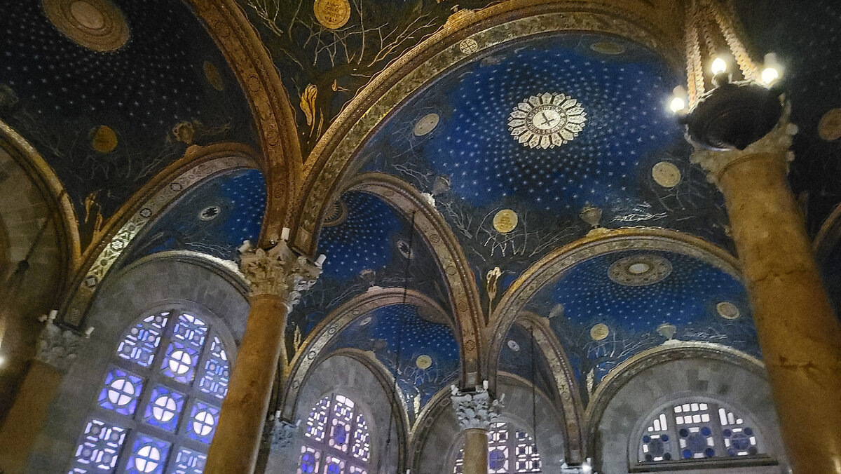 Над алтарём помещена мозаика, на которой изображена сцена с молитвой Иисуса в Гефсиманском саду. По бокам можно увидеть другие библейские события - Иудин поцелуй, предательство и арест Христа.