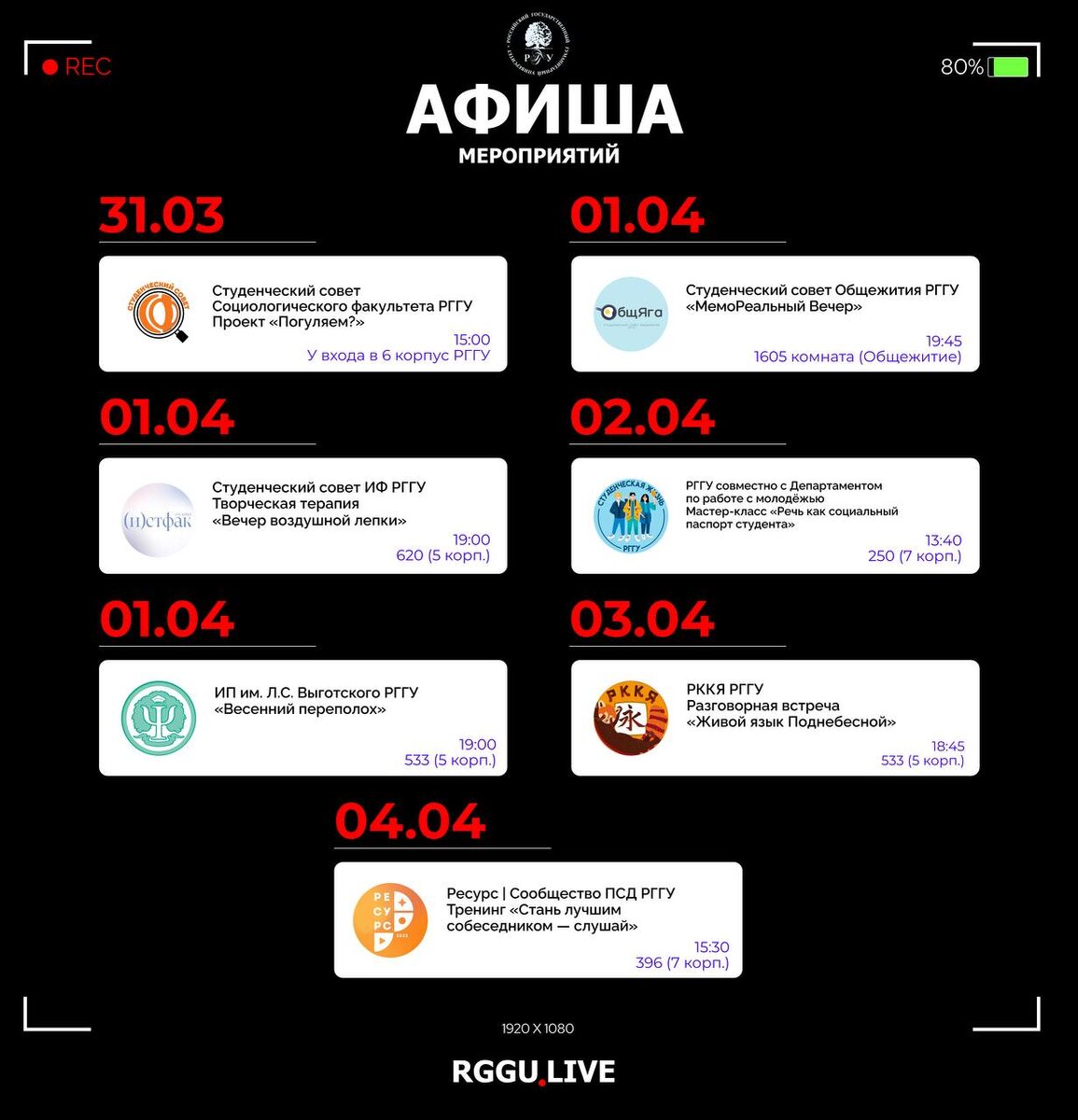 🥳 Афиша предстоящих мероприятий 📢 Студенческий совет Социологического факультета РГГУ запускает проект «Погуляем?» Подробнее здесь 👈 📌 31.03/ 15:00/ У входа в 6 корпус РГГУ 📢 Студенческий совет Исторического факультета РГГУ приглашает на творческую терапию «Вечер воздушной лепки» Подробнее здесь 👈 📌 01.04/ 19:00/ 620 (5 корп.) 📢 Институт Психологии им. Л.С. Выготского РГГУ организует мероприятие «Весенний переполох» Подробнее здесь 👈 📌 01.04/ 19:00/ 533 (5 корп.) 📢 Студенческий совет Общежития РГГУ устраивает «МемоРеальный Вечер» Подробнее здесь 👈 📌 01.04/ 19:45/ 1605 комната (ул. Кировоградская, д. 25) 📢 РГГУ совместно с Департаментом по работе с молодёжью предлагают принять участие в мастер-классе «Речь как социальный паспорт студента» Подробнее здесь 👈 📌 02.04/ 13:40/ 250 (7 корп.) 📢 Разговорный клуб китайского языка (РККЯ) РГГУ зовёт на разговорную встречу «Живой язык Поднебесной» Подробнее здесь 👈 📌 03.04/ 18:45/ 533 (5 корп.) 📢 Ресурс | Сообщество ПСД Р