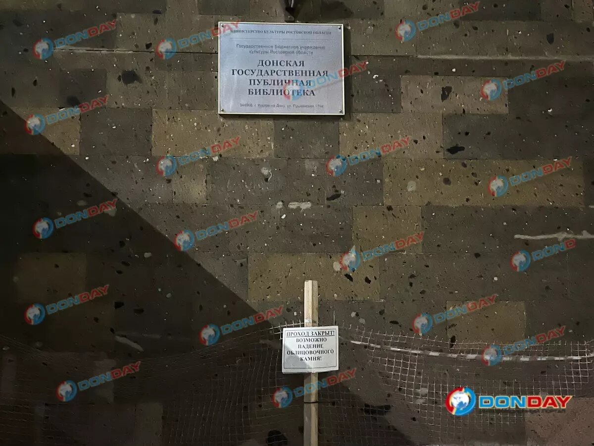 На кадрах видно, что фасад библиотеки рушится. Местное руководство пыталось реанимировать аварийный фасад, но всё оказалось тщетным. Пятна бетона только ухудшают внешний вид донской достопримечательности. Облицовочный камень обрушается даже около входа, где ходят люди.