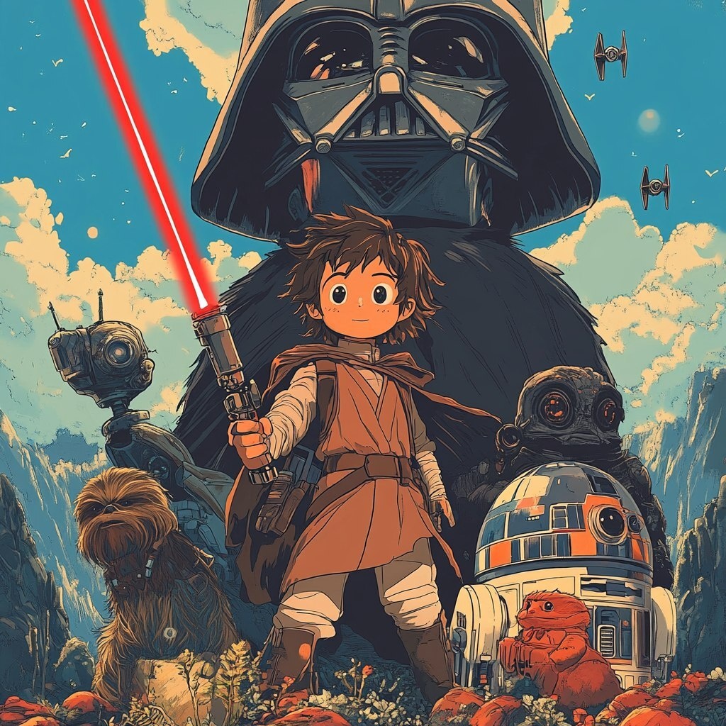 Создано на основе запроса: characters in a Star Wars poster in the style of Studio Ghibli