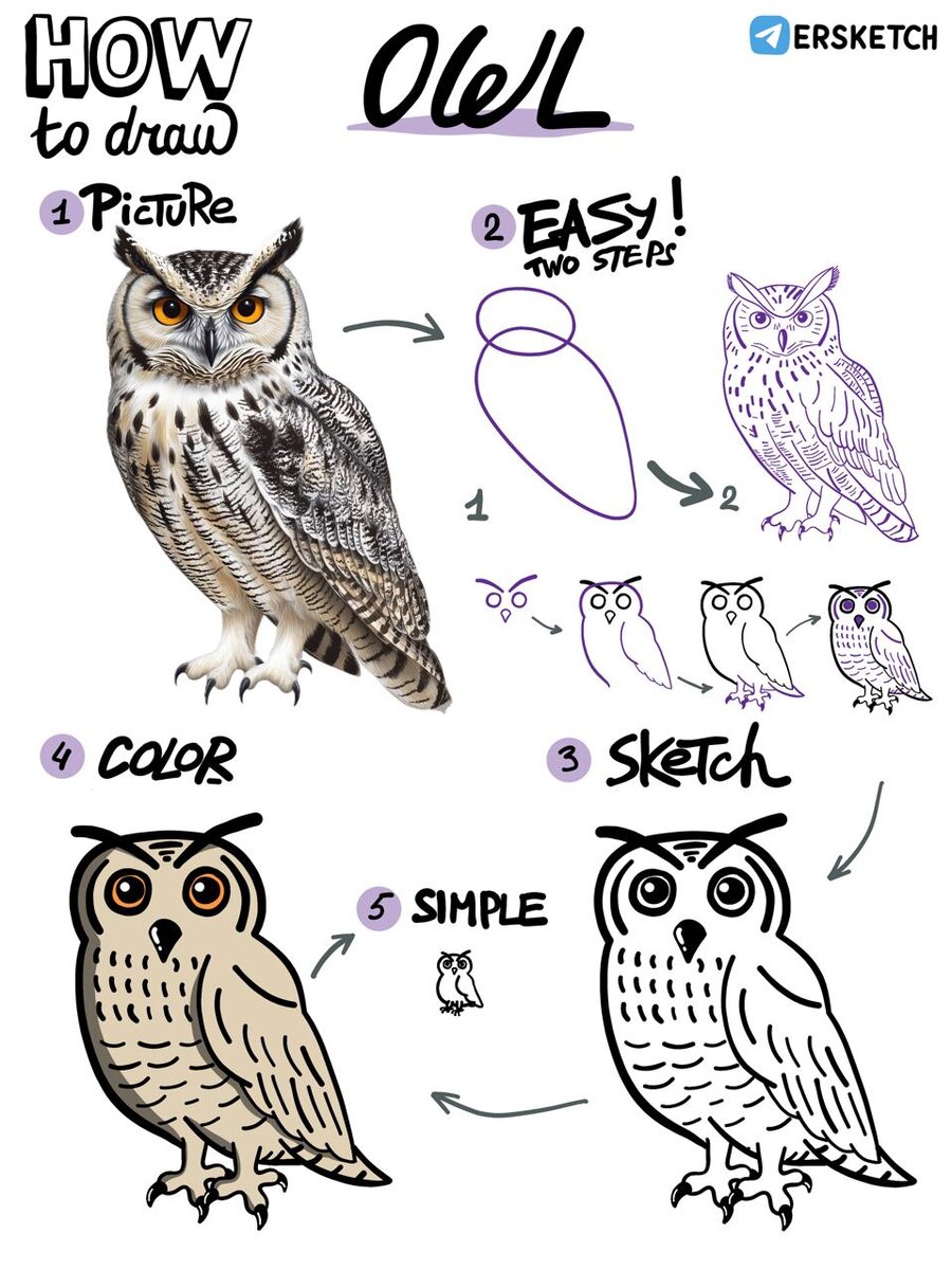 #HowToDraw #WSC2025 №13 Для того чтобы нарисовать сову, просто нужно совершить два шага: 1. Нарисовать два овала 2. Дорисовать остальную сову Если простой способ вам не подходит – начните с глаз. У совы большие круглые глаза, а над ними – строгие брови. Ещё между глазами есть клюв. Вокруг моськи у совы довольно круглая голова, под ней пухлая тушка, а внизу самое сложное – лапы с когтями.